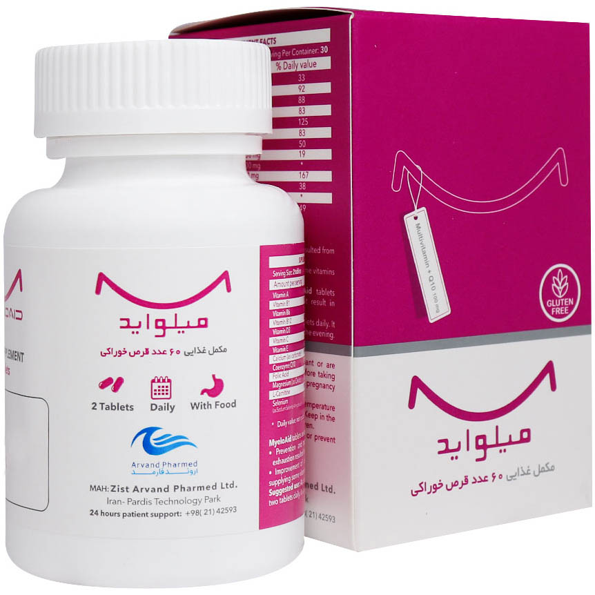 قرص میلو اید اروند فارمد یک قرص دارای انواع ویتامین‌های مختلف (D۳,A,B۱,C,E,B۱۲,B۶ و فولیک اسید)، ریز مغذی‌ها، مواد معدنی (کلسیم، منیزیم و سلنیوم) است. این محصول یک قرص روکش‌‌‌دار بنفش رنگ است و به تعداد ۶۰ عدد در بطری وارد بازار می‌شود. می‌توان گفت با خرید مولتی ویتامین هایی مانند قرص میلو اید می‌توان تمام ویتامین‌ها و مواد معدنی مورد نیاز بدن را تامین کرد.